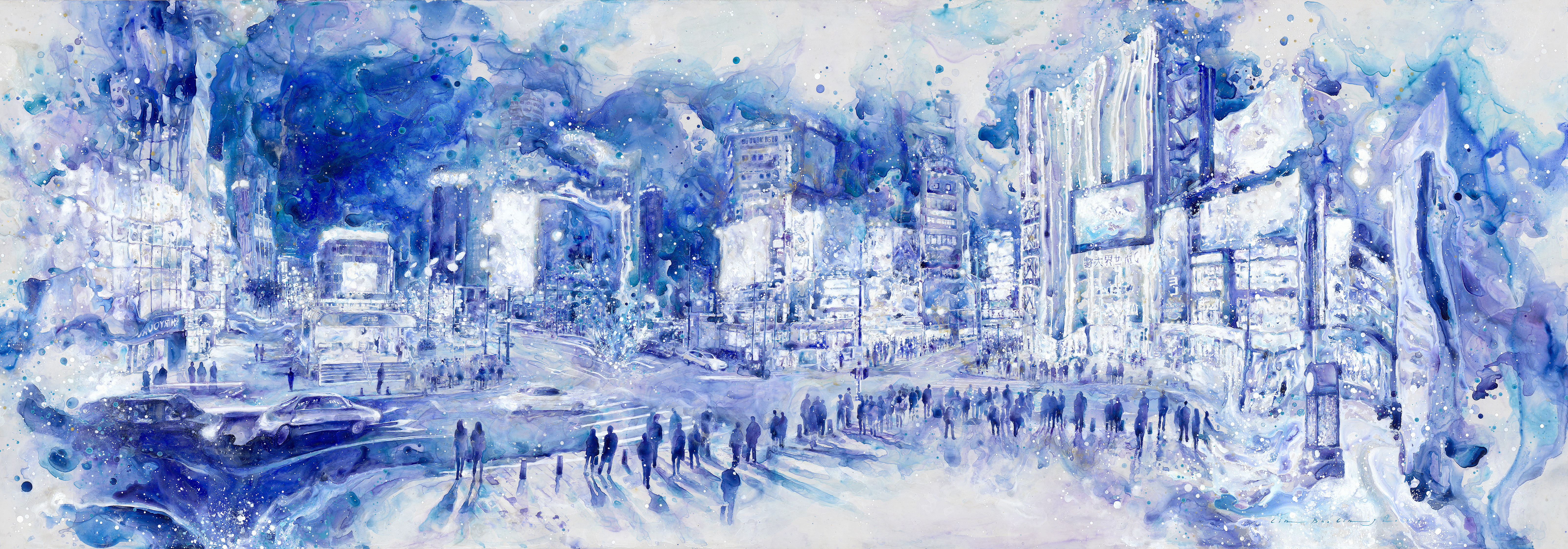 【記者陶怡軒台北報導】繁華的西門町商圈,人潮隨著製圖膠片上渲染的水漬流動,長達2公尺的橫幅,帶領觀者進入熟悉又迷幻的台北街頭。畢業於國立台灣師範大學美術學系碩士班水墨組的藝術家林葆靈,於10月20日起在索卡藝術中心舉辦個展《夜未央》,以夜景作為主題,透過渲染手法揉合夜晚中的光與影。