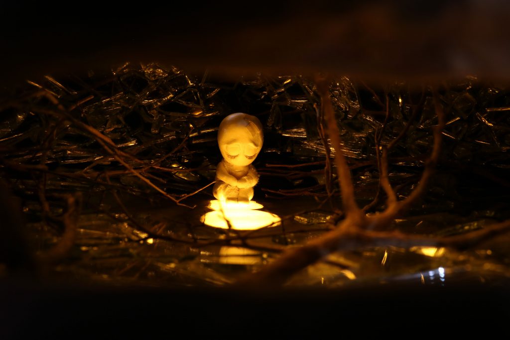 除了畫作,現場更有數樣黏土捏製展品,〈沒有名字的小傢伙-永夜〉以碎鏡子和枯枝營造感傷的氛圍。 圖/陶怡軒攝「我常處理夜晚的強烈光影,漸漸發現光跟影是一體兩面的,我在作品中主要是追求對立的統一、融合。」林葆靈解釋,期待觀者透過作品中大量暈染開的色彩,感受到光影並不是極端的對立,他也以此期許自己能接受事物的不同面向。