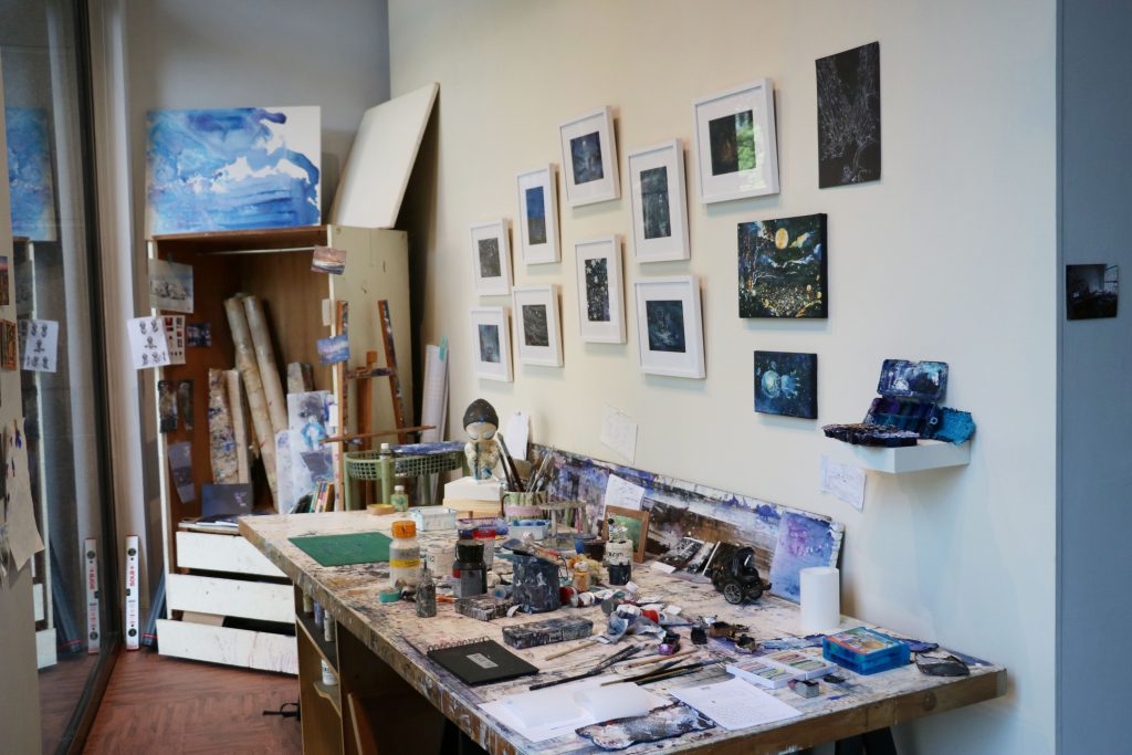 我很喜歡展覽的這個佈置,它在門口的櫥窗位置,特別能吸引民眾走進來。在這個區域可以看到藝術家平常作畫的工具、空間,除此之外還有一些創作過程中意外的產物,像是藝術家拿來調色的盒子,裡面剩餘的壓克力顏料長久累積下來,最後可以整塊剝落下來,像是一塊一塊色彩鮮艷的巧克力,彷彿成為藝術家不經意創作出來的作品。