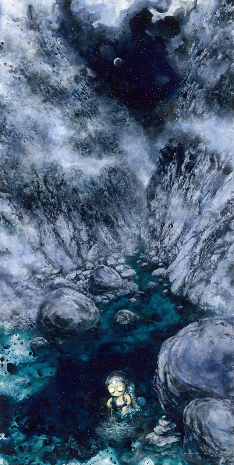 〈黑暗中過河Ⅲ〉講述林葆靈的溯溪體驗,人物右下方描繪的疊石,指引正確的方向,是一種讓人安心的象徵。 圖/林葆靈提供採訪後記